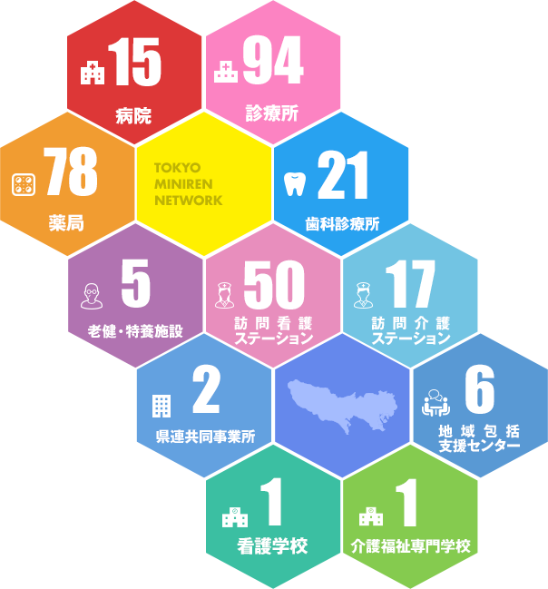 病院15、診療所115(歯科診療所21を含む)、薬局78、訪問看護ステーション50、県連共同事業所2、看護学校1、介護福祉専門学校1、老健・特養施設5、地域包括支援センター6、訪問介護ステーション17、その他を含め合計315箇所が加盟しています。