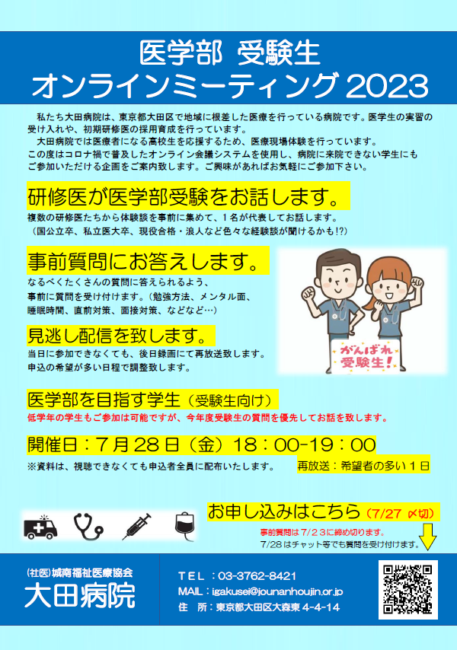 この度はコロナ禍で普及したオンライン会議システムを使用し、病院に来院できない学生にもご参加いただける企画をご案内致します。ご興味があればお気軽にご参加下さい。