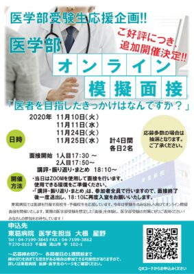 9月に、医学部受験生のみなさん向けにオンラインで模擬面接を開催しましたが、ご好評いただきましたので、この度、追加で開催いたします。