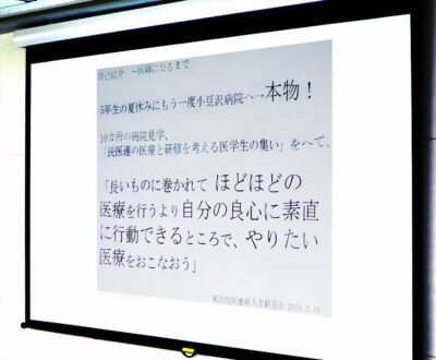 - 先生が様々な病院をみたうえで民医連は自分の良心に素直に行動できるところだとおっしゃっていたのを聞き、改めて民医連に進んだのは間違いではなかったなと思いました。