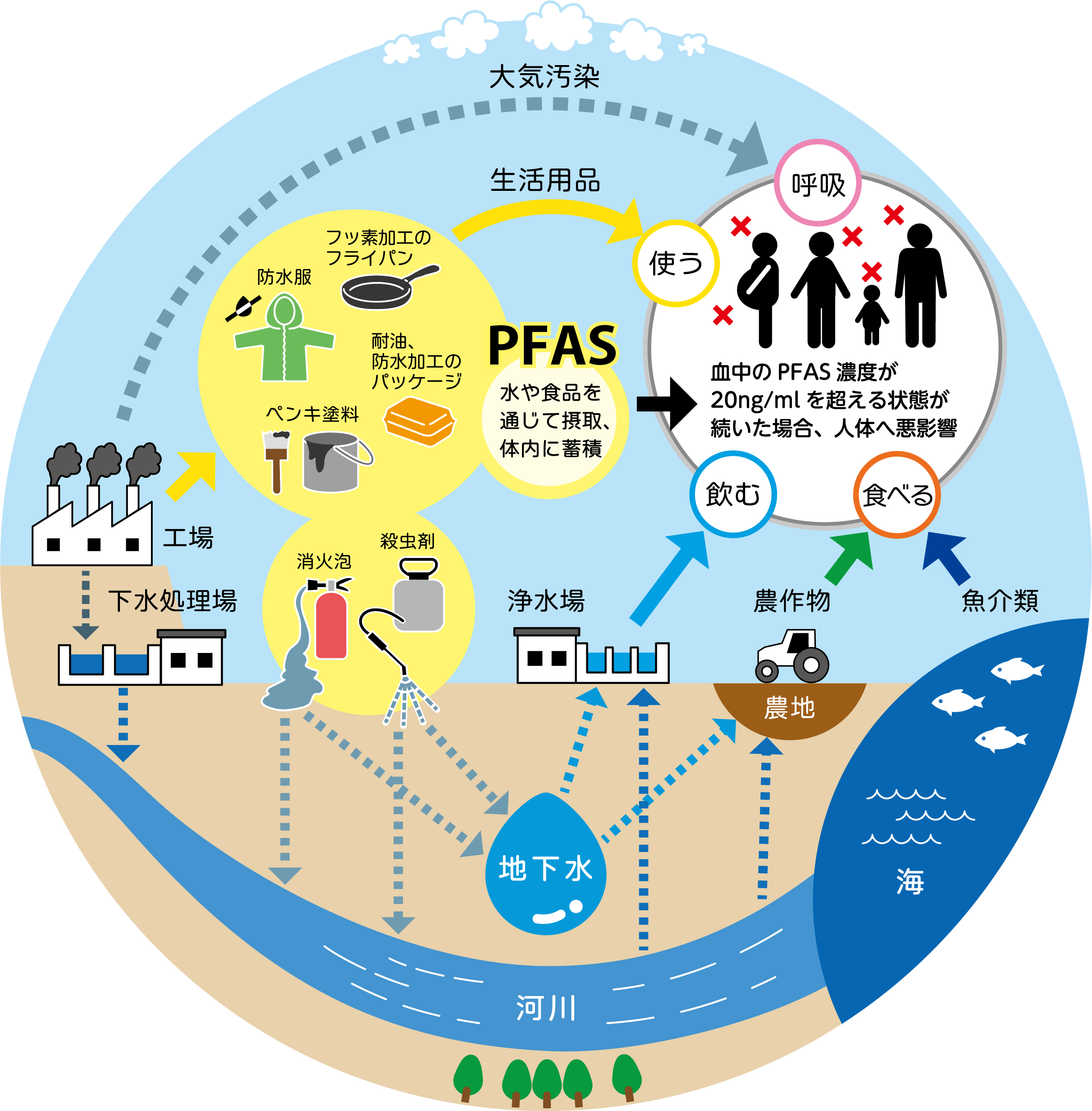 工場や軍の基地から排水と共に放出されたPFASは、長く環境中に残り、地下水や河川水から取水した水道水を通じてヒトの体内に取り込まれます。発がん性などさまざまな健康影響の恐れがあり、世界的に規制が強められています。半減期は5年程度で長く体内に蓄積され健康に影響を及ぼし続けます。